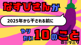 others 「なすびさんが2025年から干される前にやりたい10のこと」 の振り返り まずはこちらをご覧ください。 では、こちらに挙げられている項目のうち、実際に実施できたものはいくつでしょう?アンサーチェック! ということで、年始に書いたやりたいことの振り返りをやっていこうと思います。結果を〇×△でつけて、コメントをつけて... 2025.12.31 others